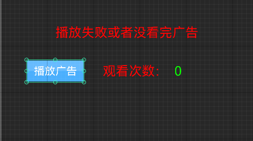 添加一个文本控件text,文本内容填写为“观看次数:”,在为其添加一个text类型的子控件,命名为num,初始值设置为0。 添加一个文本控件error,文本初始内容设为“播放失败或者没看完广告”。 添加一个按钮button,文本内容设为“播放广告”。 如下图: