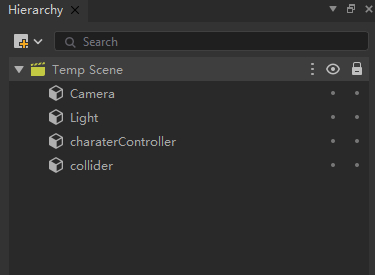 首先在场景中创建一个胶囊体charaterController和一个立方体collider(如下图),为它们分别添加一个CharaterController组件和BoxCollider组件,且为BoxCollider组件勾选触发器属性,并将它们的位置分别设置为(0,0,0)和(0,2,0)。最后将脚本挂载在charaterController游戏对象上。